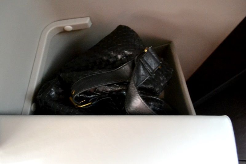 頭上にはバッグを収納できる棚が備え付けられており、折りたためるテーブルはノートパソコンを使うにも便利な
