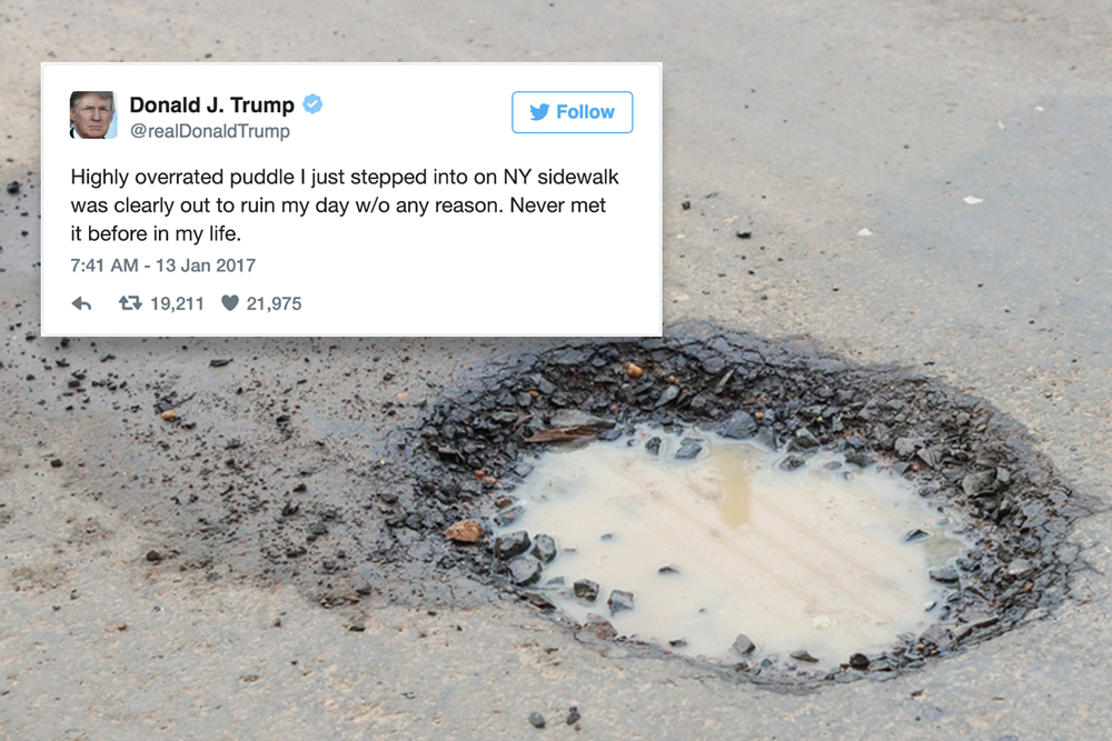 New York (dpo) – President-elect Donald Trump took to Twitter today having just stepped into a puddle in the middle of the road outside Trump Tower in New York. In his Tweet, he blasted the small pool of water, calling it “highly overrated”. He went on to say that although the puddle didn’t know him, it had ruined his day with no provocation whatsoever.