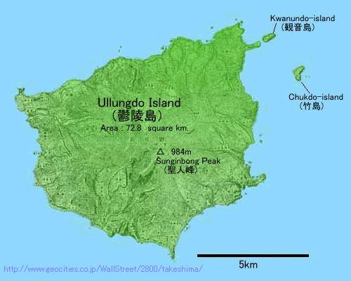 ②↓次にこれが、竹島(韓国名:独島)と鬱陵島の大きさの比較ね。鬱陵島大きいですね。竹島は小さい。