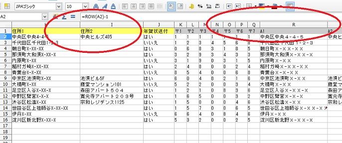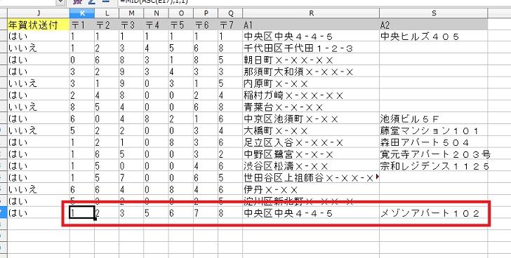 まずは、宛名印刷のデータを表計算calcで住所力の項目を入力していきます