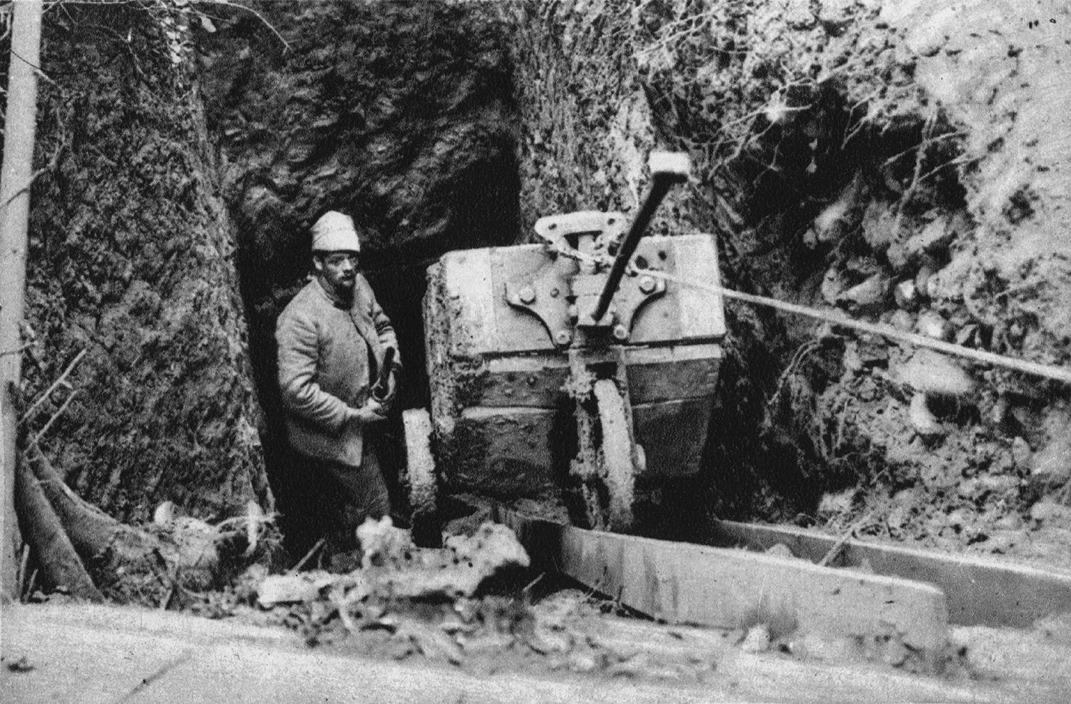 1914年8月、ベルギーのデルモンテとオーデゲンの間で機関銃を構えタバコをふかすベルギー兵士。