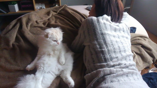 「なんだかんだ言ってもママの隣が落ち着くニャ~」