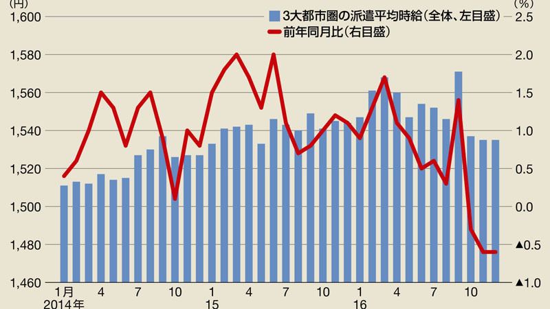労働市場をみる限り、労働者側にとって今春闘も追い風が吹き、賃上げの環境は十分整っているようにみえる。2016年12月の有効求人倍率は1.43倍(季節調整値)。1991年7月(1.44倍)以来の売り手市場が続いている。