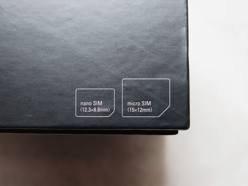 IMEIなどの印刷された個装箱底面のシール(写真=左側)と側面に描かれている実物大の対応SIMカード表記(写真=右)