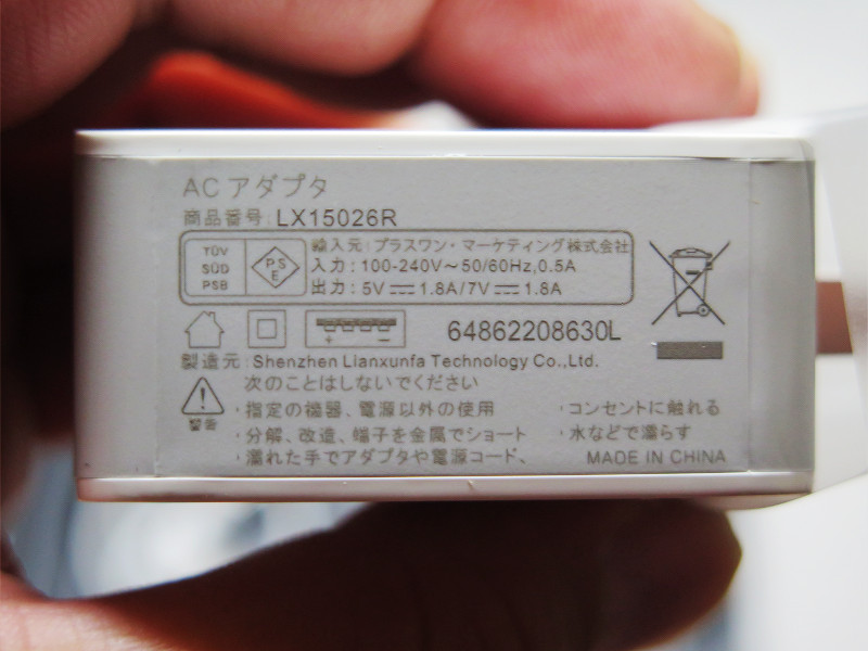 USBチャージャー底面に描かれている注意書き。出力的にはUSB2.0相当