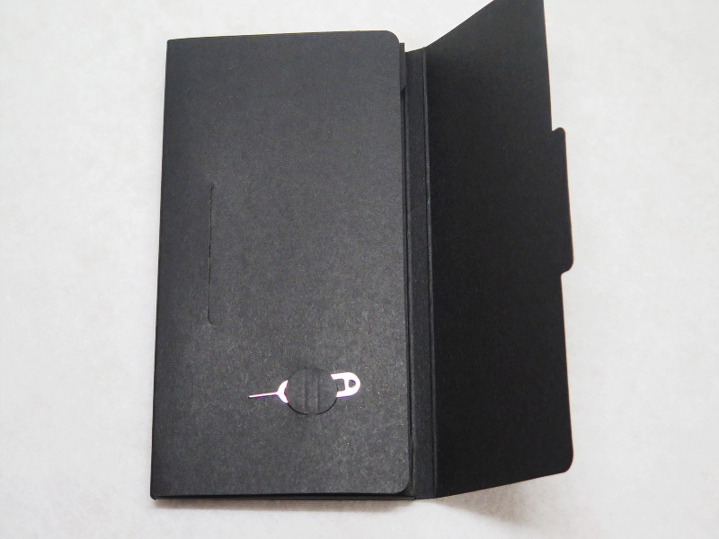 同梱物のマニュアル類が収められた箱には開くとSIMカードスロット解放用のピンがありました。