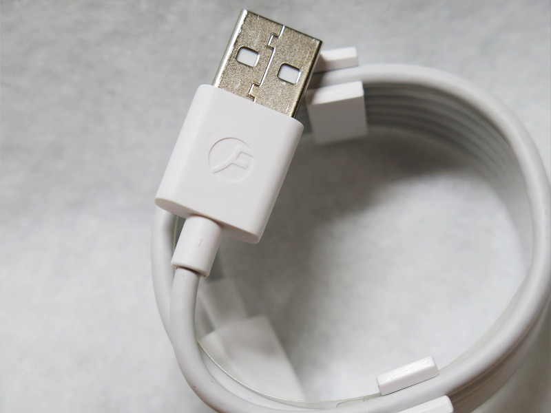 USBケーブルは端末に接続する側がUSB Type-Cコネクターになっているもので、USBチャージャーへ接続する側のほうにFREETELの「F」のロゴマークが入っているオリジナルのものです。
