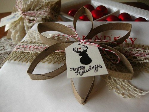 トイレットペーパーの芯の中にコメを入れて、包装紙やリボンなどで装飾をするだけで完成。
