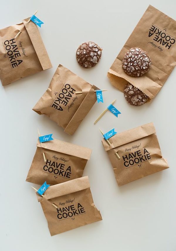 クラフト紙で出来た袋に好きなメッセージをプリント。つまようじをフラッグのように見立て、クラフト紙の口を折りたたんでつまようじで留めるだけです。ナチュラルだけどセンスを感じるラッピングがとってもオシャレですね。キッズが集まるパーティーなどではつまようじの先をカットしたり、先をステッカーなどでくるんであげるのもオススメです。シンプルな雰囲気のラッピングはまるでショップのクッキーのようです。