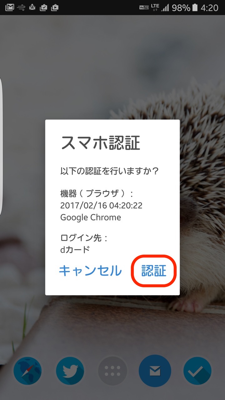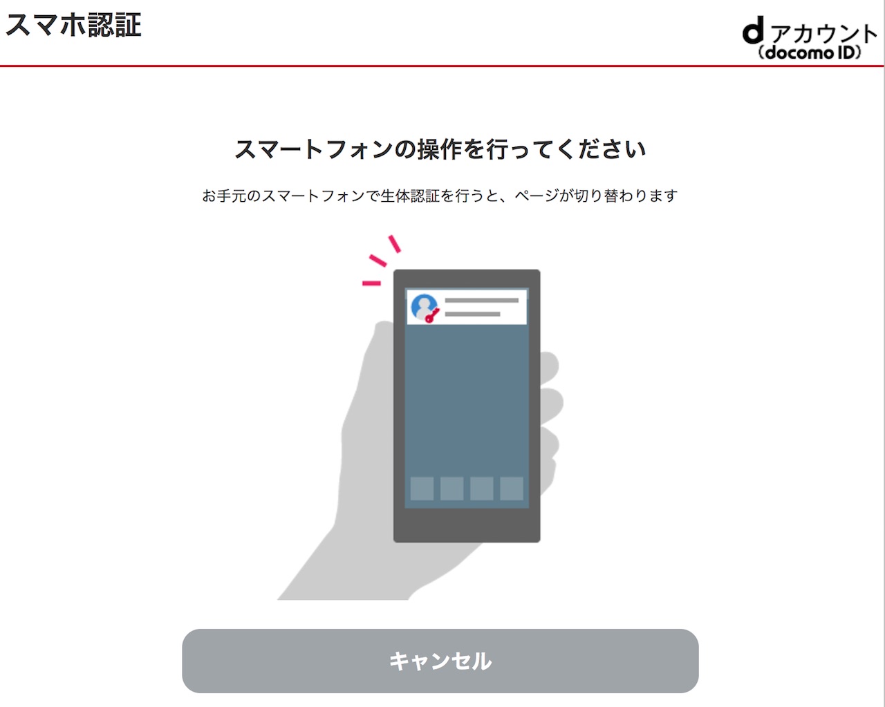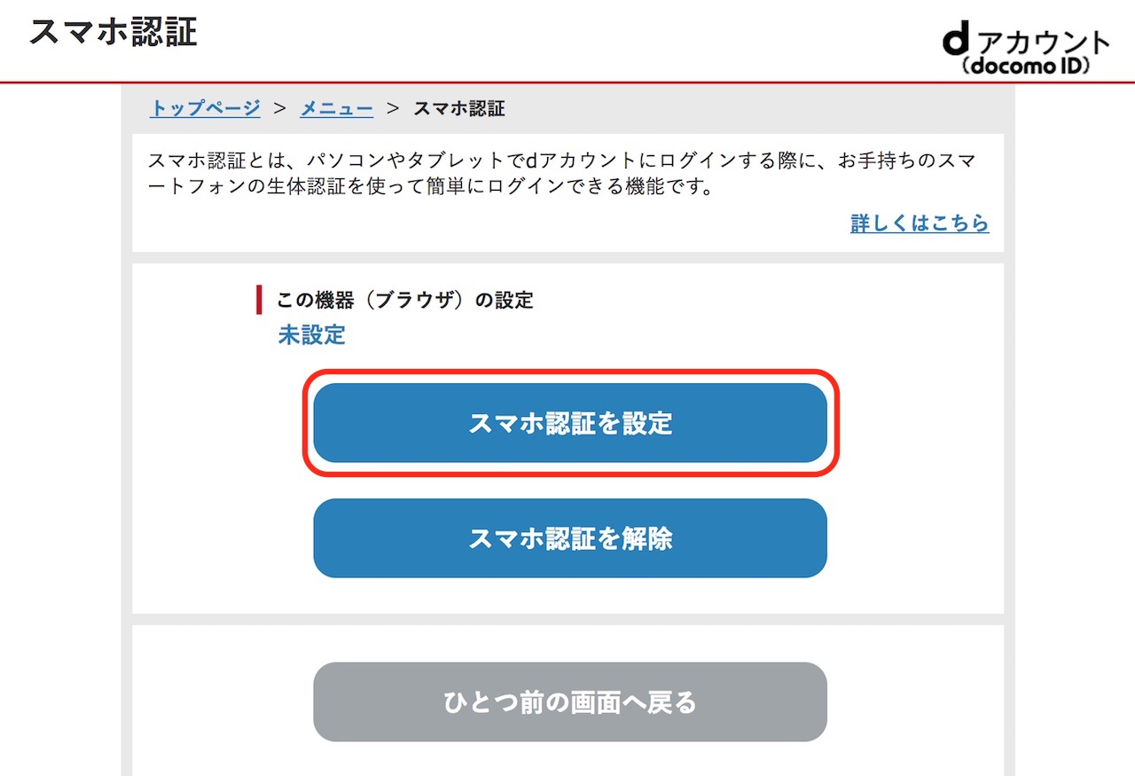 では、スマホ認証を使ってみましょう。スマホ認証を設定した場合には、dアカウントのログイン画面が「スマホで認証」ボタンだけになります。dアカウントのIDが合っていることを確認し、このボタンを押します。