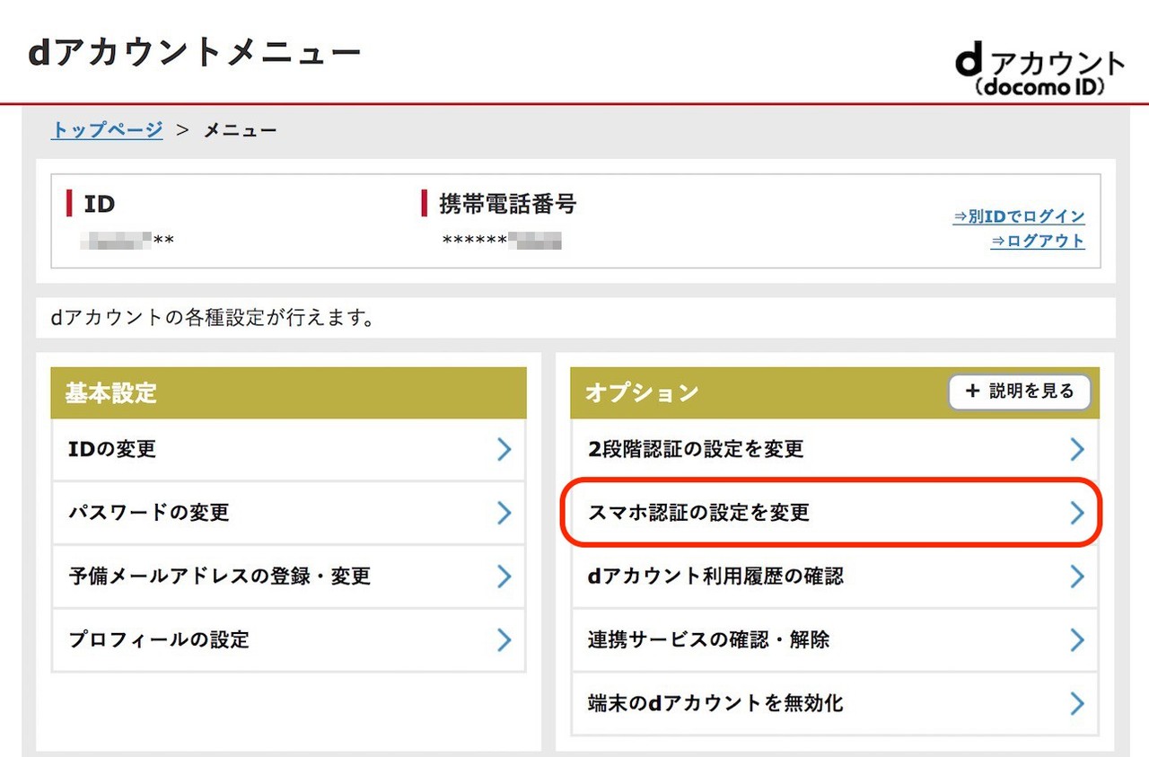 続いて、NTTドコモの公式Webページ「スマホ認証とは? | dアカウント」でも確認できますが、設定ページ「dアカウントメニュー」にdアカウントでログインして「スマホ認証の設定を変更」を選びます。