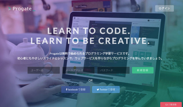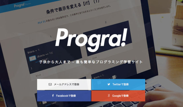 Progra!は、穴埋め問題を解く感覚でプログラミングを学ぶことが出来るサイトです。Twitter、Facebook、Googleのアカウントでログインすることができるので、手軽にはじめられるのでおすすめです。