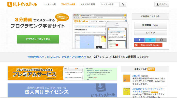ドットインストールは、動画で手順を確認しながらプログラミングを学ぶことができます。1本あたり3分程度の動画となっているので、スキマ時間を利用することができ、続けやすいプログラミング学習サービスの1つです。Webサービス関連の言語に加えて、iPhoneアプリ開発やAndroidアプリ開発、UnityAmazon Web Servicesなどの幅広い授業を受けることが可能です。