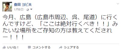 もちろん、良くあるネット記事のように、インターネットで拾った情報とインターネットで拾った画像を雑に繋ぎ合わせて「いかがでしたか?皆さんもぜひ、広島の旅を楽しんで下さいね♪」みたいにシメるカスキュレーションメディアと一緒にされるわけには行きませんので、事前の広島県の観光課の方々との打ち合わせ、及び僕のTwitter、FB、LINEなど各SNSから頂いた現地の方の情報などを総合して、マジで推薦出来るオススメスポットを選定しましたのでご紹介したいと思います!