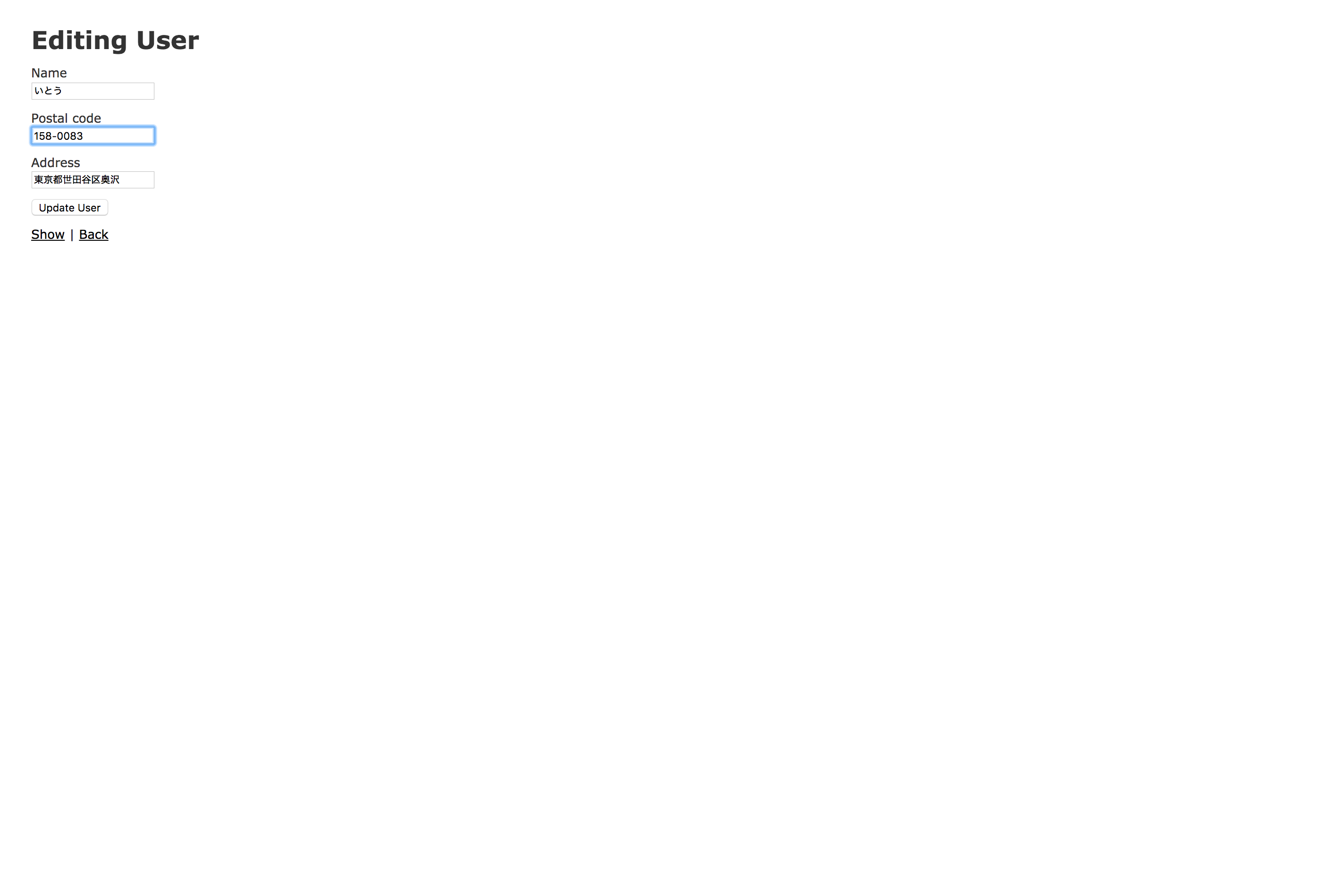 $ rails g scaffold User name postal_code address