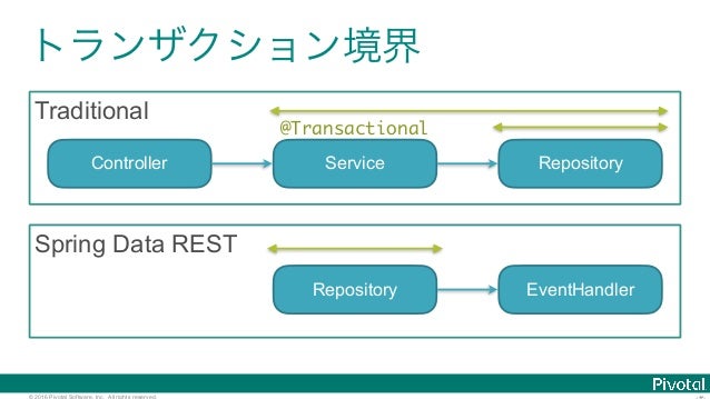 40. 40. © 2016 Pivotal Software, Inc. All rights reserved. Repository --> REST API public interface FooRepository extends Repository<Foo, Long> { @RestResource(exported = false) List<Foo> findBySeminarId(Long seminarId); Optional<Foo> findOne(Long id); void save(Foo foo);