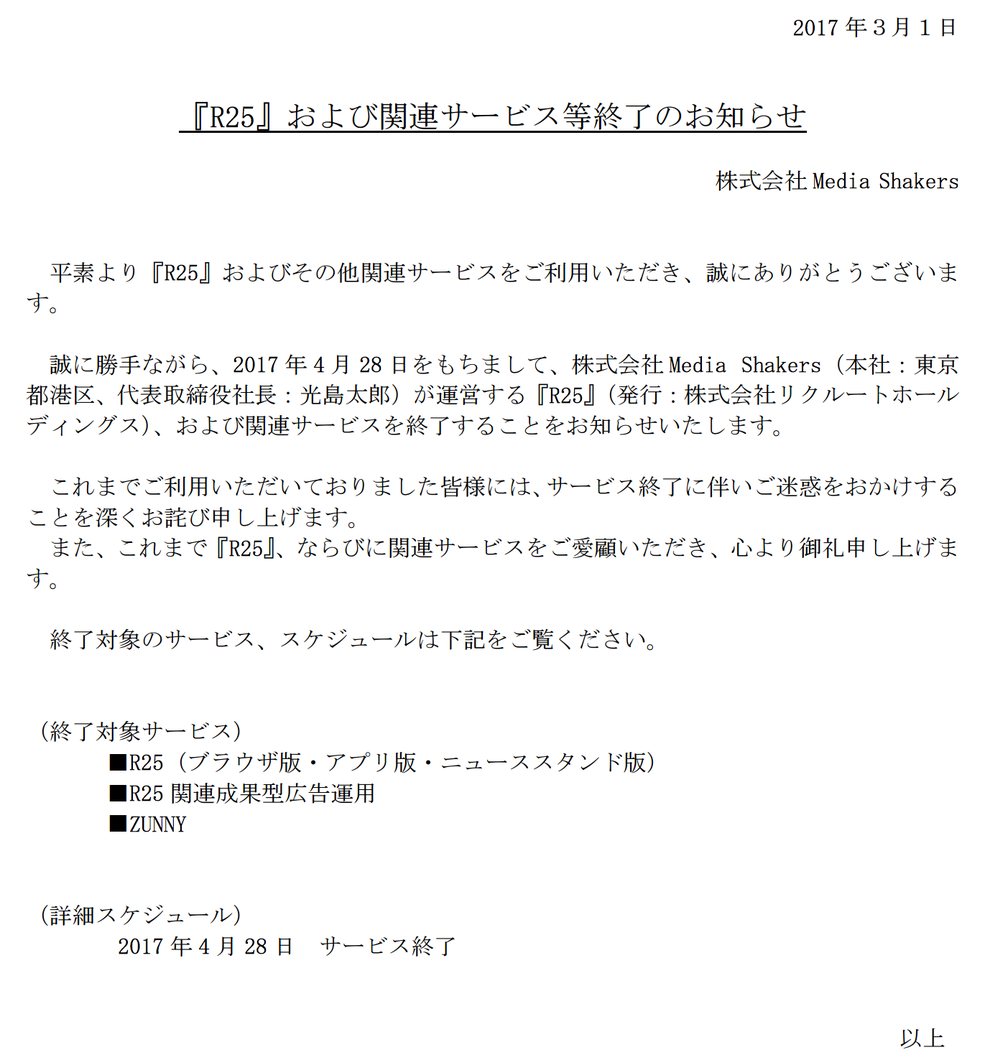 リクルートと電通の合弁会社・Media Shakersは3月1日、同社が運営するネットメディア「R25」および関連サービスを終了することを発表した。