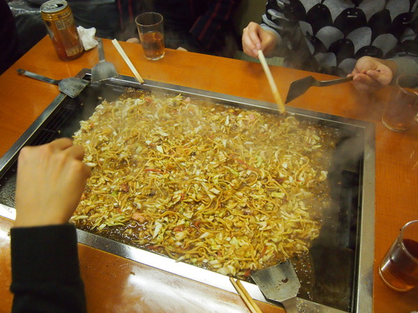 鉄板すべてを埋めつくしても一度ではのりきらず、2回にわけて食べました。キャベツ、紅ショウガ、ちくわ、揚げカス、魚肉ソーセージと具だくさんです。