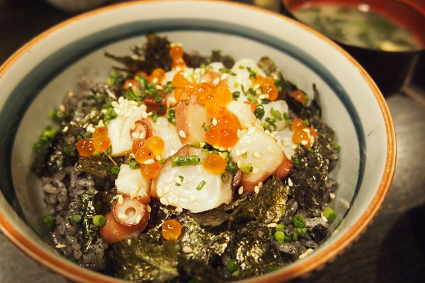 まずは千駄木のタコ料理専門店「三忠」です。たこの吸盤からあげ、たこ墨で真っ黒になった丼メシなど珍しいタコ料理をいろいろ食べられます。