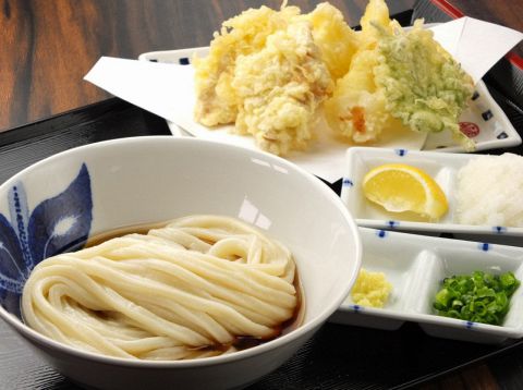 好きなうどんに、海老天盛、サラダ、小鉢付きのお得なセット。うどんはざる・かけうどん・ぶっかけ・釜揚げ・湯だめの中から、選ぶことができる。