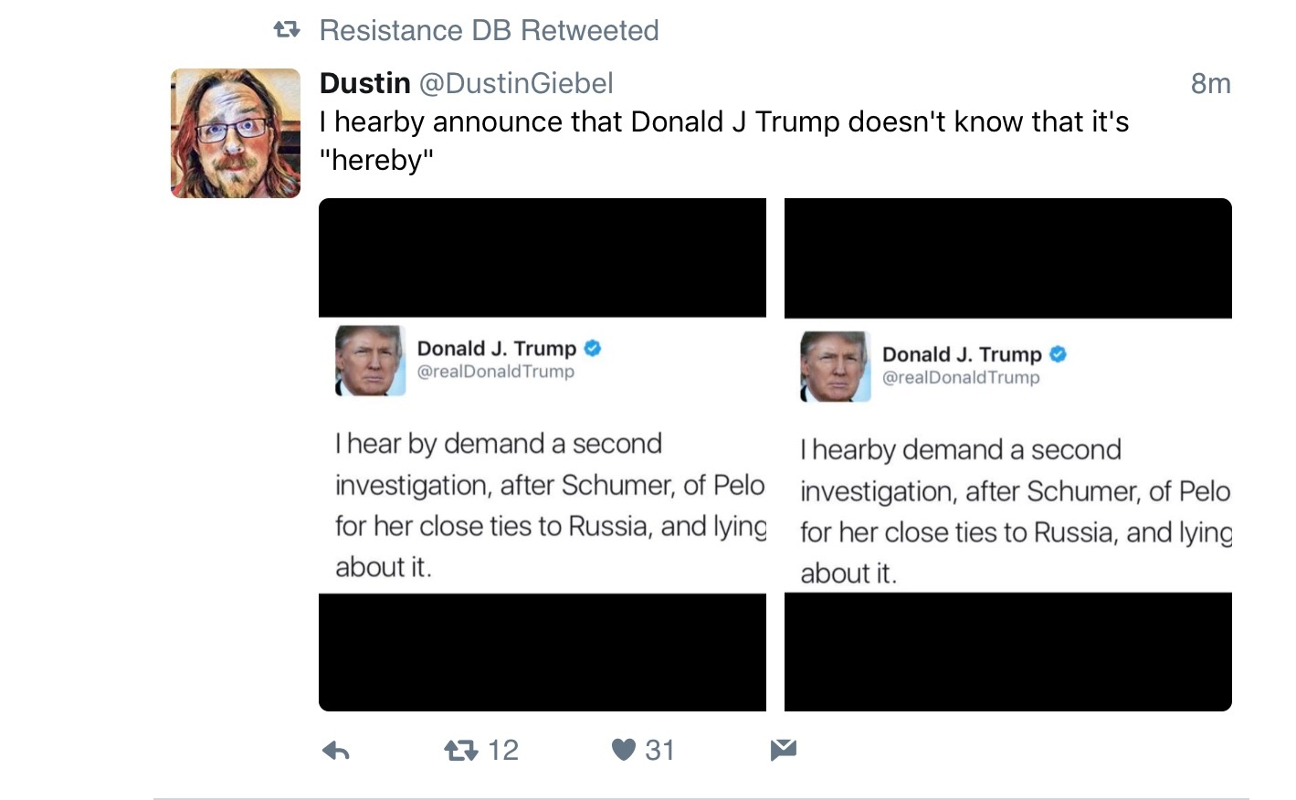 Donald Trump has one response to all the stories trickling out about him and his campaign having been in constant collusion with Russians, the Russians helping steal the election for him, and so forth, and it’s that “NO PUPPET. NO PUPPET. YOU’RE THE PUPPET.” Or in other words, “I’m not getting peed on by a Russian Hooker, you are getting peed on by a Russian hooker, you’re a VERY WET BOY!” Or, as he tweeted at Senate Minority Leader Chuck Schumer Friday:
