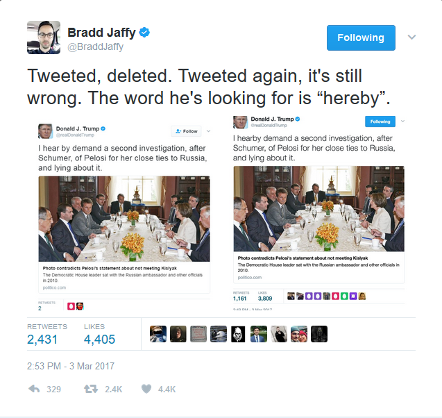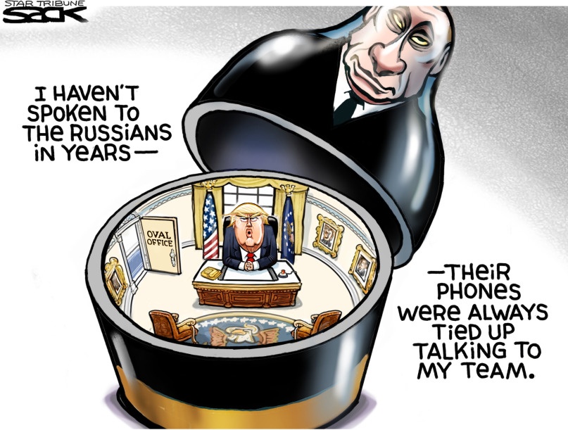 It seems like perhaps Donald Trump is under the impression that the crime he is accused of is having met a Russian, or having met Putin. Maybe that’s why he could never decide over the course of his campaign whether he and Putin were complete strangers, or maybe they are BFFs because Putin called him “brilliant.” (Putin did not call him “brilliant,” at least not in the sense that the word means “smart.” The Russian word means more like “shiny.”)