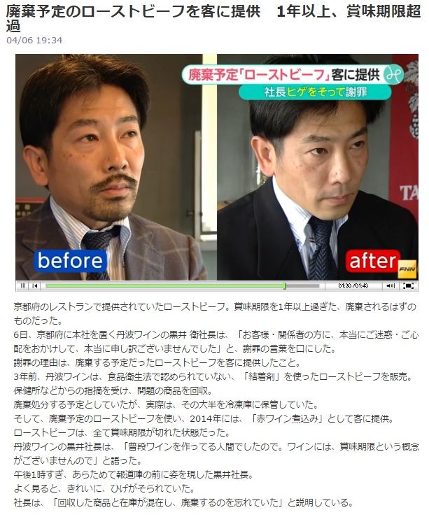 ■回収ローストビーフ、客に提供 丹波ワイン「廃棄忘れ」印刷用画面を開く 【 2016年04月06日 05時19分】 京都新聞http://www.kyoto-np.co.jp/top/article/20160406000001賞味期限切れだったローストビーフを、客に提供していた丹波ワイン(京都府京丹波町)ワイン製造販売や飲食事業を展開する「丹波ワイン」(京都府京丹波町)が、2013年に結着剤を使ったローストビーフを販売して食品衛生法違反を指摘され、廃棄すると府南丹保健所に伝えながら、賞味期限切れの状態で14、15年の一定期間、客に提供していたことが5日、同社への取材で分かった。同社は「加熱処理をせず、牛ロースト丼としても提供した」と説明。同保健所は廃棄処分するよう文書で指導した。食品衛生法の「特定加熱食肉製品」の基準では、半生状態のローストビーフは食中毒菌の混入の恐れがあり結着剤の使用を認めていない。同社の黒井衛社長は5日、京都新聞社の取材に対し、「牛ロースト丼は加熱処理せず、スライスしただけ」と、製造基準違反のローストビーフを提供していたことを認めた。客の健康被害は確認されていないという。丹波ワインは13年当時、京都市内の老舗料理店の了承の下に複数のブロック肉を結着剤で固めて製造していた。同料理店が百貨店などで販売し、丹波ワインも自販していたが、製造基準違反が発覚し、すべて販売中止に追い込まれた。同保健所によると、丹波ワインは13年の問題発覚後、回収した製造基準違反のローストビーフ約50キロを「廃棄処分する予定」と保健所に伝えた。実際に処分したのは約1割で、残りは同様の手法で製造されたローストビーフの在庫計約220キロと冷凍保存していた。このうち約80キロを同社の関連会社が運営するレストラン(京丹波町)で提供。15年4月には同社での2日間の催しで牛ロースト丼として、14年4月~11月には「赤ワイン煮込み」やサンドイッチとして販売していた。同保健所によると、今年2月の調査に対し、同社は「いずれも加熱処理した」と説明したという。廃棄方針だったローストビーフは13年9月までの製造で、提供時は同社が定める賞味期限(製造後180日)を、1年以上過ぎていた恐れがある。黒井社長は「回収した商品と在庫が混在し、廃棄するのを忘れていた。ご利用のみなさまに、大変なご心配をおかけして誠に申し訳ない」と謝罪した。