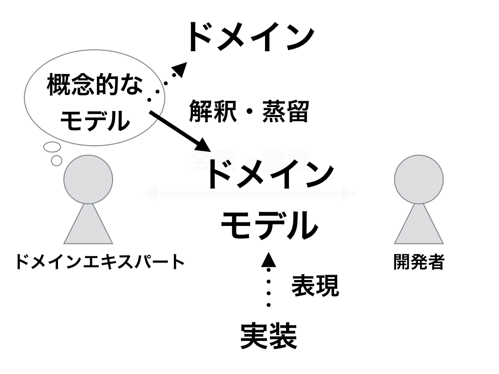 ユーザーだったり、同僚だったり、さまざまです。 ドメインエキスパートが何かわかったので、ドメイン駆動設計で何をするのかに戻りましょう。 ドメインエキスパートの頭の中には、ドメインを構成する物や振る舞い、関係性などの概念的な何かがあります。