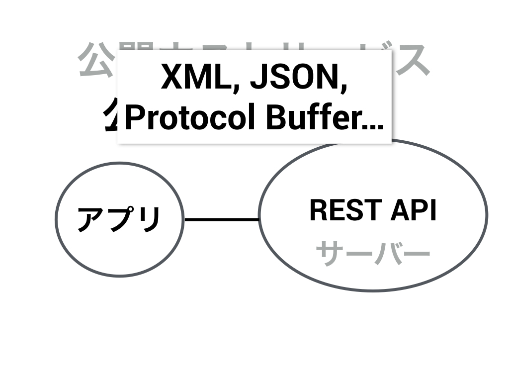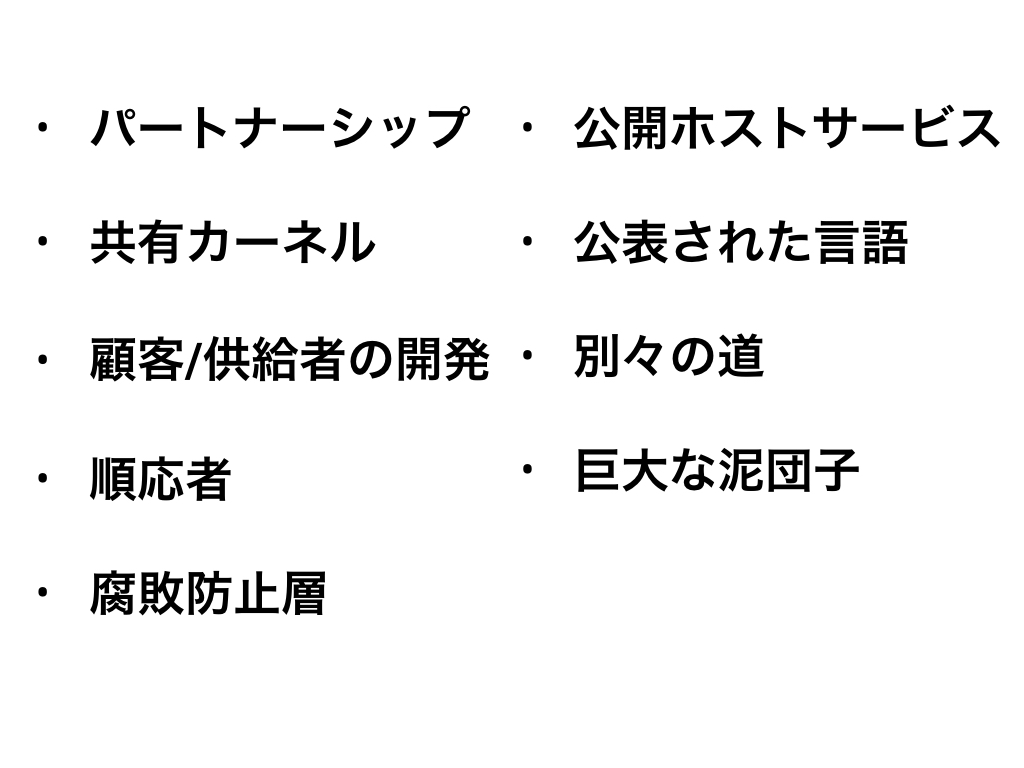 それぞれに個別に対応するのは大変なので外部に方法を公開するよということです。方法はRESTかもしれないしRPCかもしれない。 公開ホストサービスと一緒に使われることが多いのが公表された言語です。 わかりやすく言うと、XMLとかJSONとかProtocol Buffer とか、ようは形式が公表されている言語です。 さらに一緒に取り入れることが多いのが腐敗防止層です。