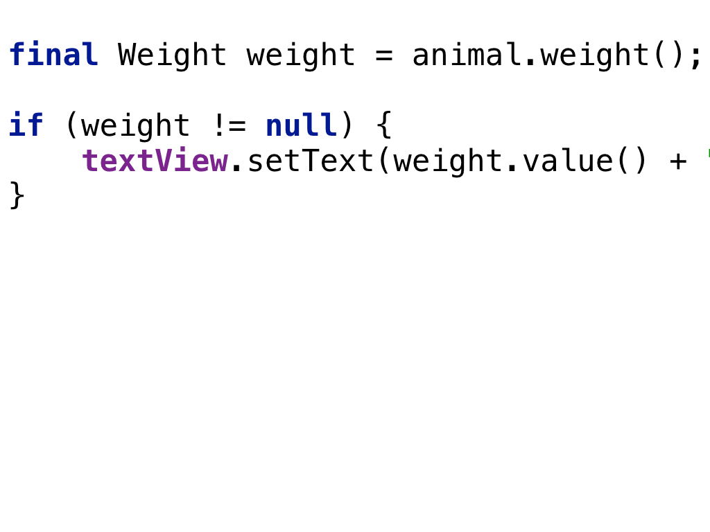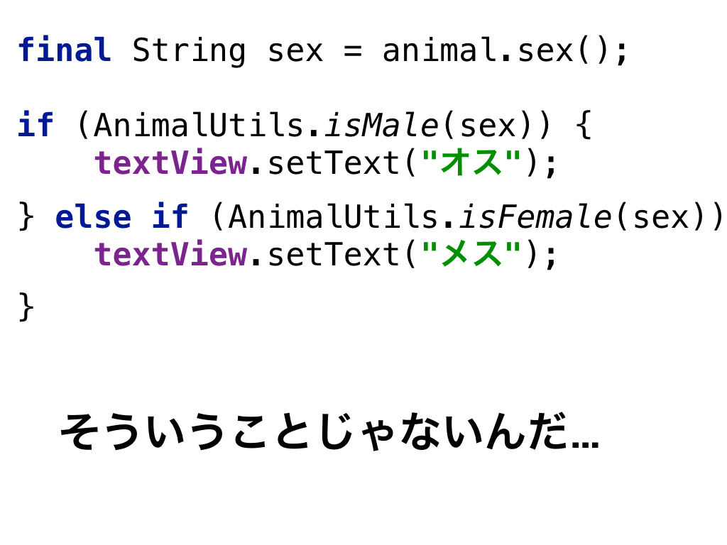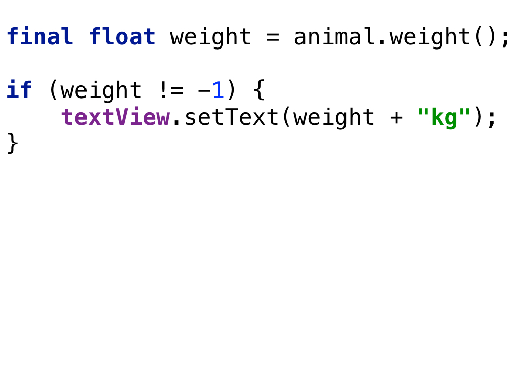 というわけで、ここからはおまけです。 ドメイン、そしてドメインモデルについて考える練習として、すごく単純な例を用意しました。 動物の体重をTextViewに表示するコードです。 体重がわからない動物のときは空表示にしたいようです。