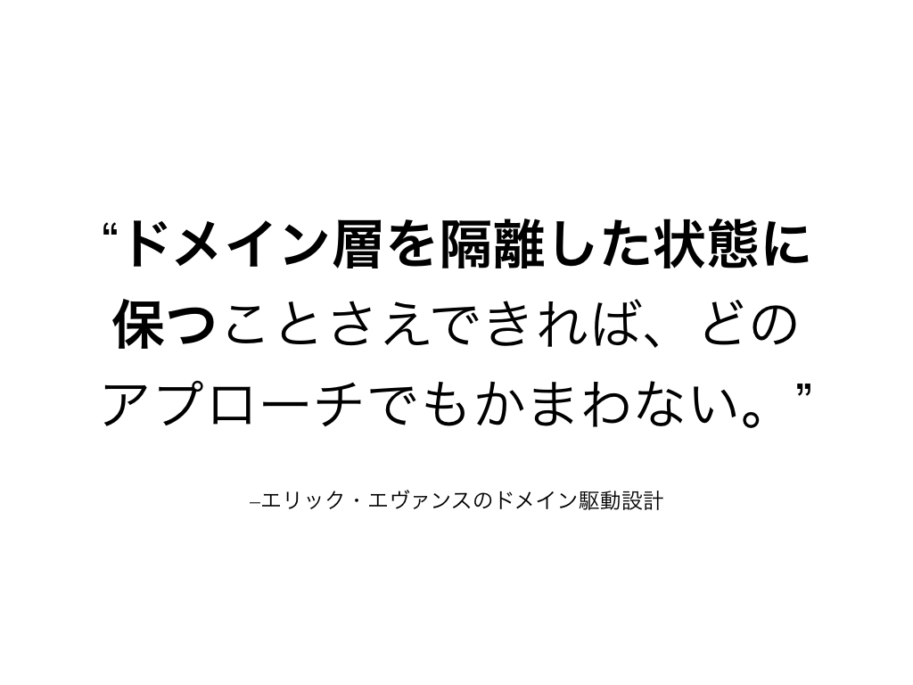 ドメイン駆動設計ではドメインモデルを作ってそれを正確に表現するようにコードを実装することであって、特定の技術的パターンをとることではありません。 「ドメインモデルを作ってそれを正確に表現するように実装したからDDDだよね?」