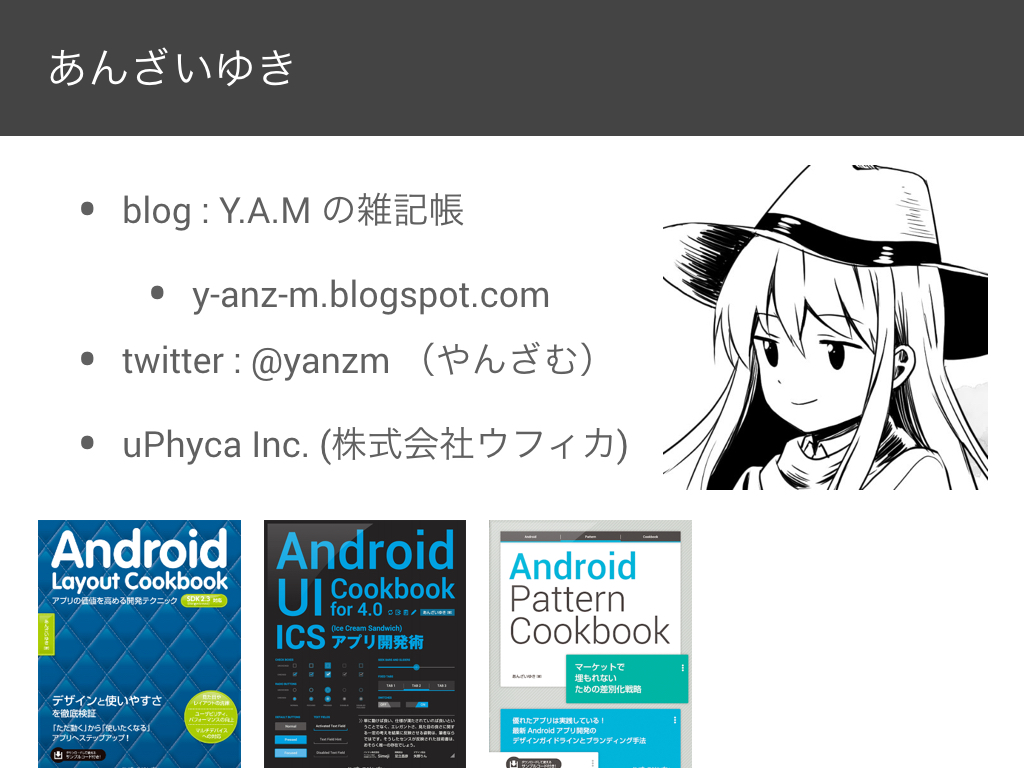 本日はドメイン駆動設計というものについて、Androidアプリ開発と絡めてお話させていただきます。 私あんざいゆきと言います。Androidアプリの開発をなりわいとしております。 長らく Y.A.Mの雑記帳というブログでAndroidの技術情報を発信しています。最近はなかなか投稿できなくなってしまいましたが、それも仕事としてAndroidに関われているためです。Androidを触り始めたころはまだ学生だったので時間があったんでしょうね。 はじめて Android に関するエントリを投稿したのは 2009 年 5 月 24 日です。当時はJavaFXを触っていたので、NetbeansでAndroidをやろうとしていたようです。 次の日にはEclipseに乗り換えるんですけどね。やっぱりAndroidアプリを開発するならEclipseですよねー。 当時のAndroidのバージョンは1.5、Fragment もなく、Support Library もなく、マルチタッチすらなく、ストアは Google Play ではなく Android Market という名前でした。