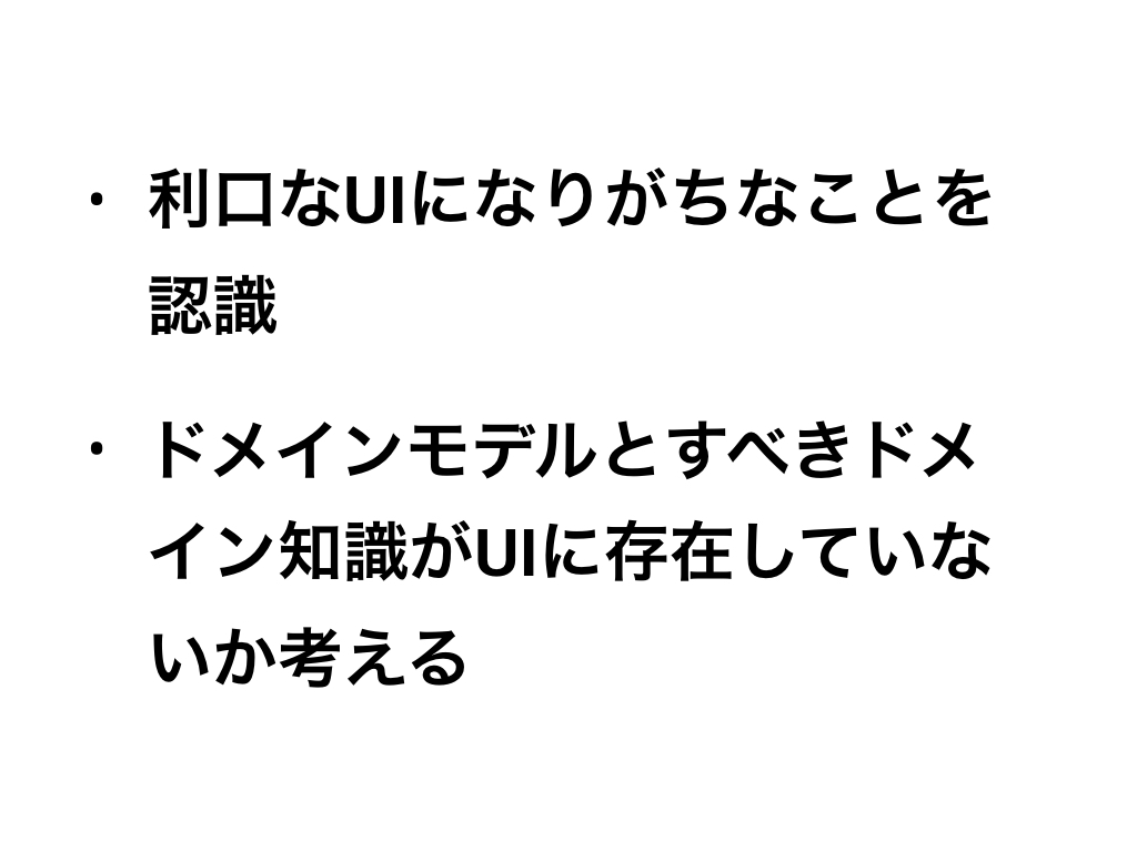 重要なのは利口なUIになりがちだと認識すること。そして、ドメインにある概念や知識、ビジネスロジックがUIに存在していないか観察し、ドメインモデルとしてUIから隔離できないか考えることです。