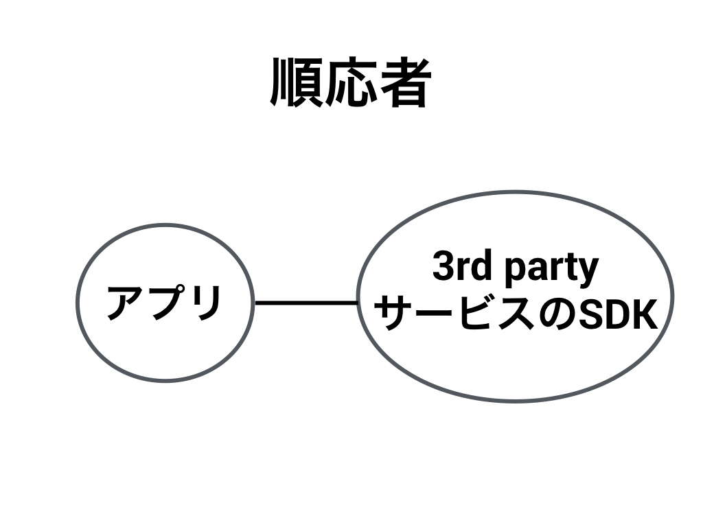 いくつかのパターンをAndroidアプリ開発でありそうな状況にあてはめてみます。 パートナーシップというのは、成功・失敗の運命を共にする関係です。例えばアプリの主要な機能がすべてそのアプリ用のSDKとして提供されている場合、これらの運命は一蓮托生であり、パートナーシップの関係が一番近いでしょう。 特定の機能を社内SDKとして提供している場合はどうでしょうか。同じ社内ですから、アプリ側のニーズに対応してくれるかもしれない。もし対応してくれるような関係性であるなら、それは顧客/供給者の関係が一番近いでしょう。 3rd party が提供しているSDKではどうでしょうか。例えば twitter や facebook SDK など。この場合我々は提供されているSDKをそのまま利用するしかありません。このような関係は順応者になります。 社内SDKであっても、アプリ側のニーズに対応してくれない関係性なら順応者になります。 公開ホストサービスについてドメイン駆動設計の本には次のように書かれています「サブシステムにアクセスできるようにするプロトコルを、サービスの集合として定義すること。そのプロトコルを公開し、サブシステムと統合する必要のある人が全員使用できるようにすること。」
