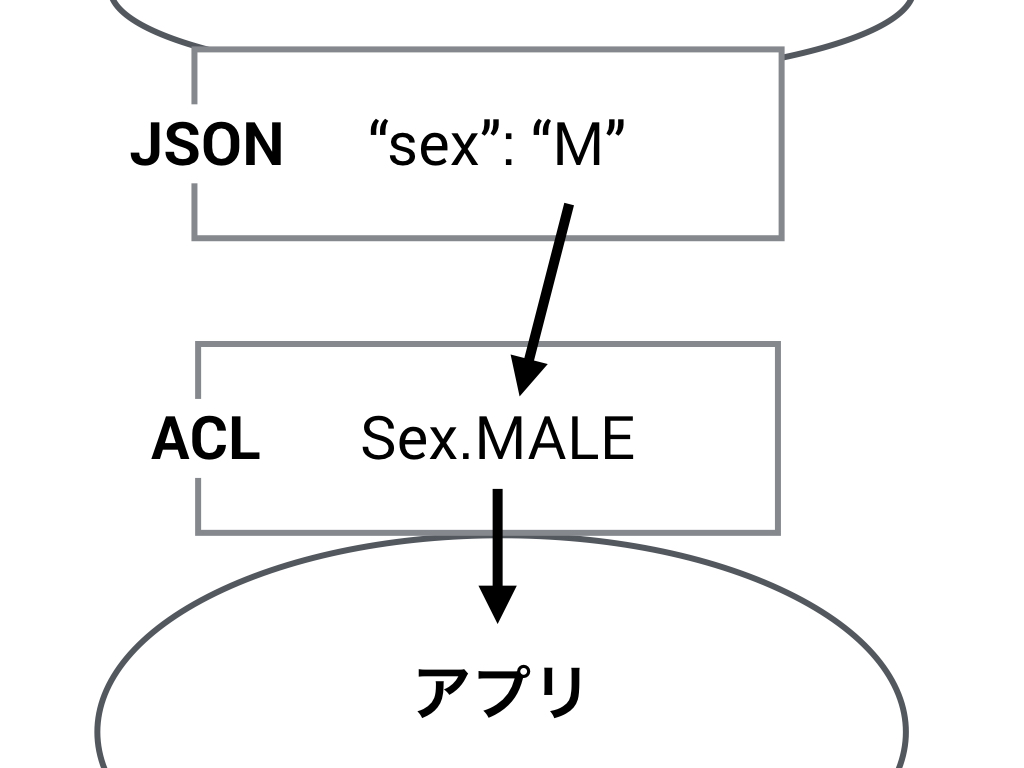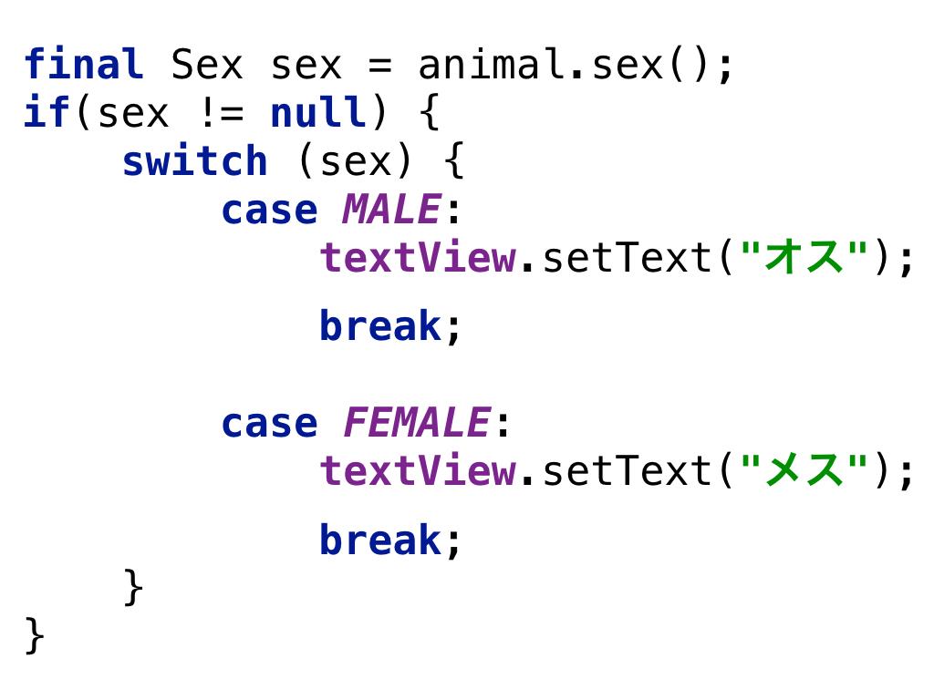 我々の頭のなかには性別という概念的なモデルがあるのだから、それを表現するドメインモデルを用意しましょう。 動物の性別を表現するモデルで、オス(MALE)とメス(FEMALE) がある。