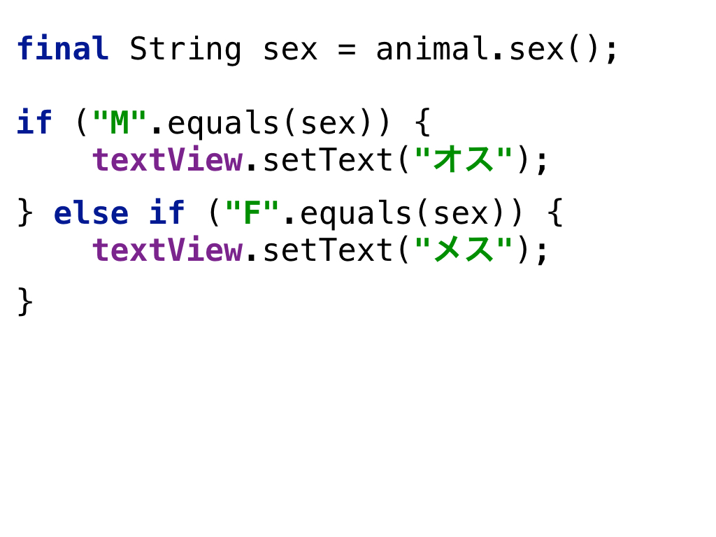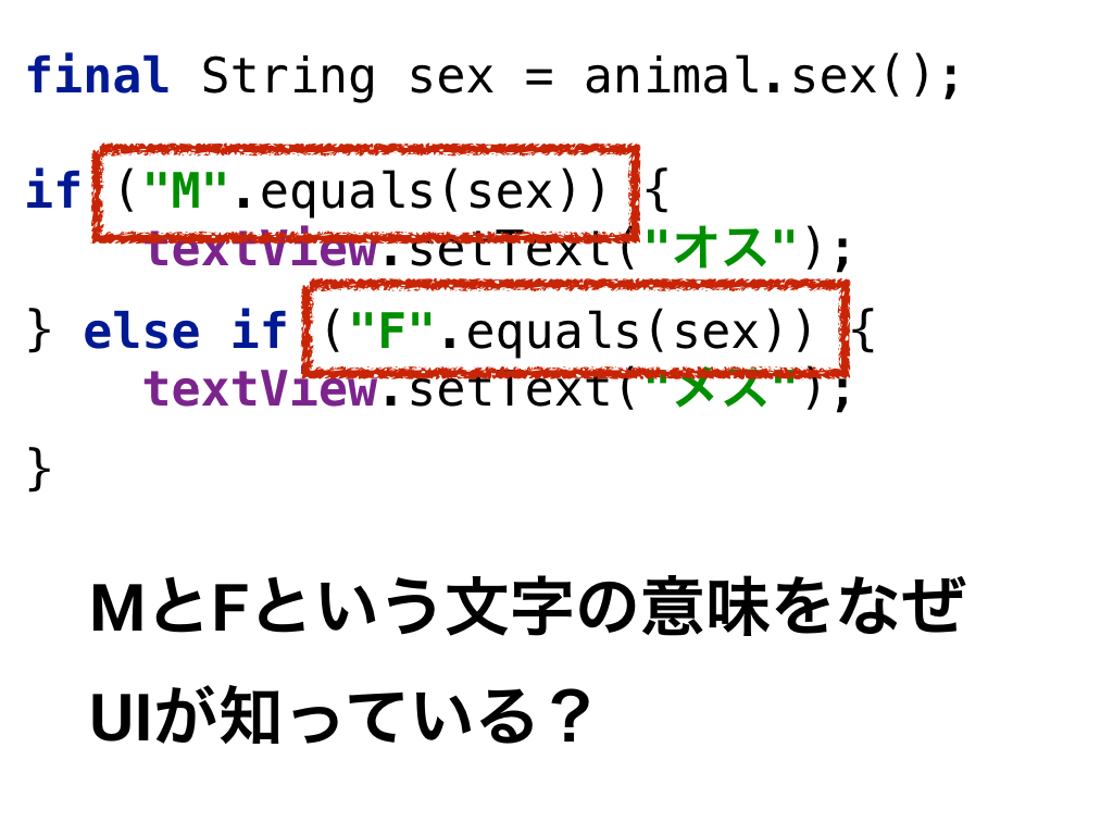 このコードにも問題がありますね。 文字列が “M” の場合がオスで”F”の場合はメスだそうです。文字列の意味をUIが知っている。なんて賢いUIなんでしょう。