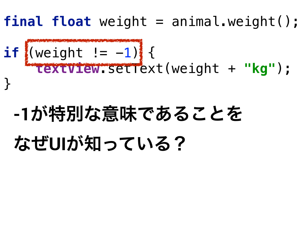 このコードには2つ問題があります。 1つ目が、-1という数字が特別な意味をもつということをユーザーインタフェースが知ってしまっているということ。 2つ目が、マイナスの体重というものが表現されてしまっていることです。