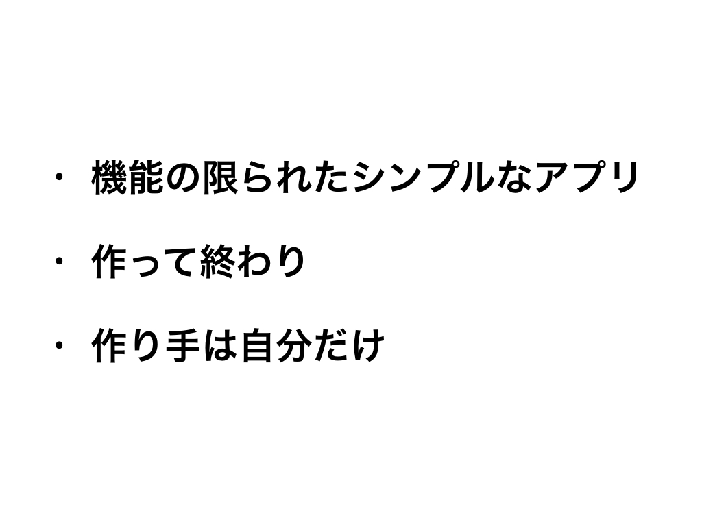 彼ら、彼女らが作るアプリはほとんどが無料で、ユーザーは開発者自身、自分が欲しいもの、自分にとって便利なものをみな作っていました。 こういったものは大抵がシンプルな単機能のもので、継続的にメンテナンスすることを考えずに作られています。 当時趣味でアプリを作っていた人で、半年後や1年後に自分のコードをみて、何をしているのかわからない、という状況になった方はいらっしゃるのではないでしょうか。私もその一人です。