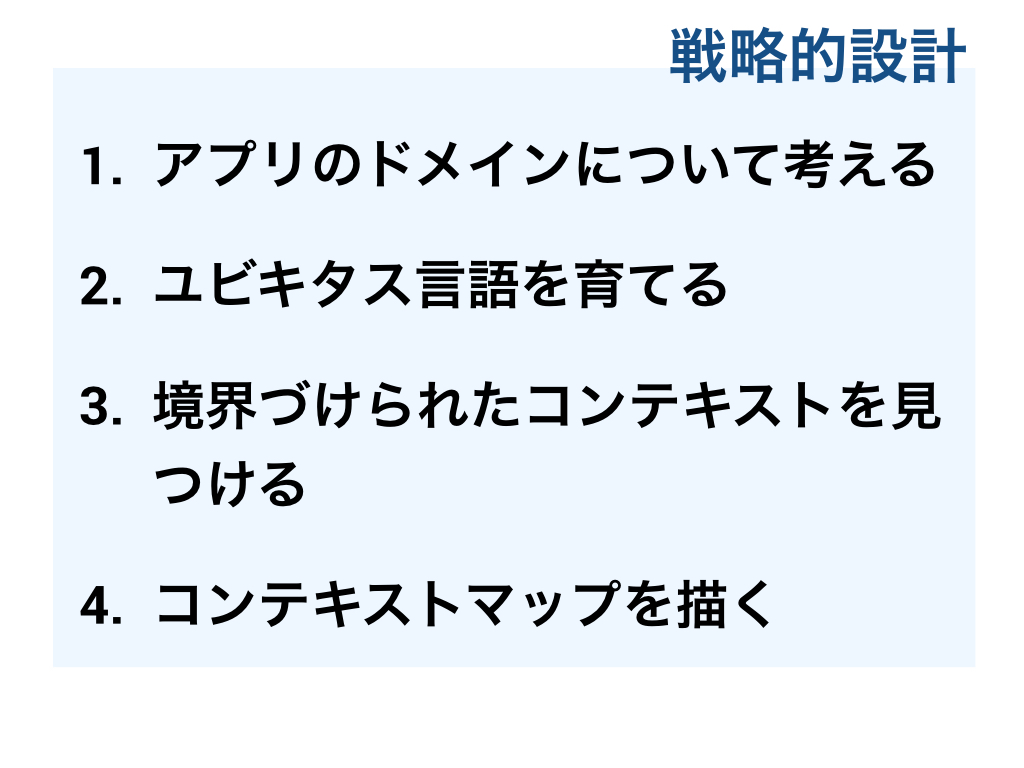 戦略的設計と戦術的設計です。 ドメインモデルを作り上げるために役立つ手法が戦略的設計 ドメインモデルからそれを表現した実装を行っていくのに役立つ手法が戦術的設計です。 今までの話にでてきたユビキタス言語は戦略的設計です。他にも境界づけられたコンテキストやコンテキストマップがあります。