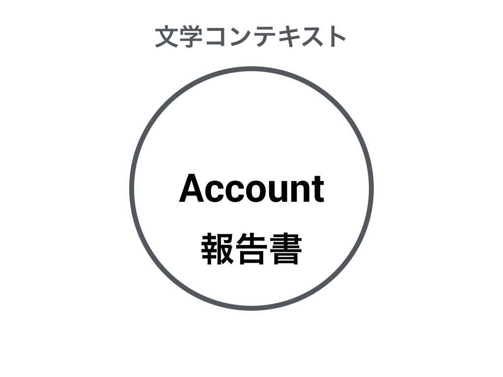 ユビキタス言語の言葉が特定の意味を持つ領域がコンテキストです。 例えばAccountという言葉があります。 この言葉がユーザー認証の文脈で語られていた場合、その意味はサービスを利用する際の利用単位のことだとわかります。 一方、銀行の文脈で語られていた場合、その意味は口座になります。 さらに、文学のもとではAccountの意味は報告書になります。 コンテキストが異なると、同じ言葉でも意味が変わります。