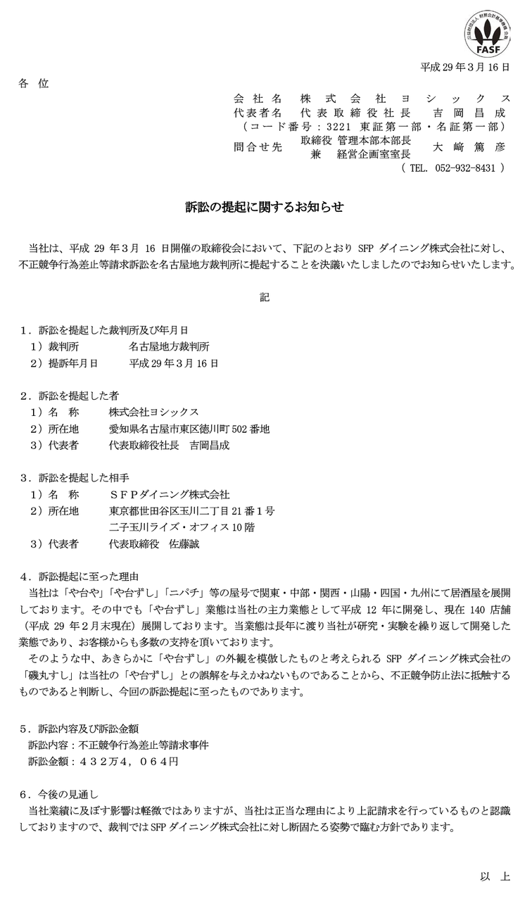 2017/03/16 15:00 ヨシックス 訴訟の提起に関するお知らせ