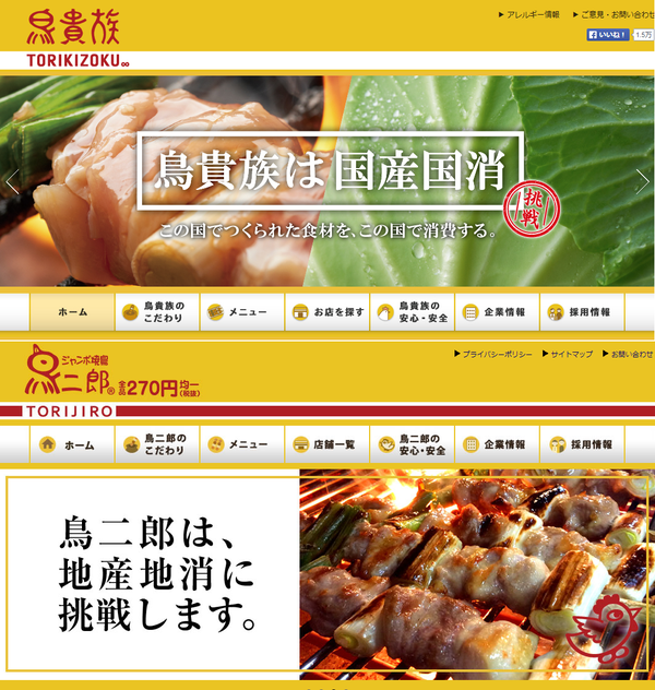 「鳥貴族」と「鳥二郎」、ホームページのデザインまでそっくりで笑ったし、もうキャプチャ撮ってる時点でどっちがどっちか分からなくなってたレベル pic.twitter.com/8v7mOoZTNH