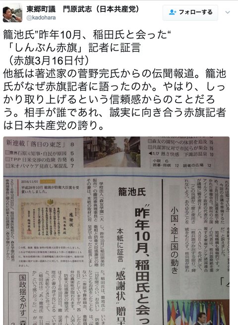 - しんぶん赤旗が「昨年10月稲田氏と会った籠池氏本紙に証言」3月16日に公開していた記事を削除