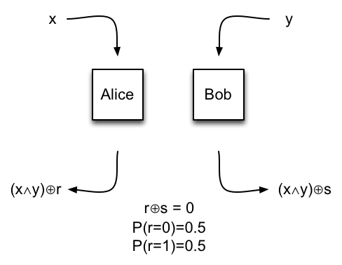 (+ being xor) which I don't think is what you want; did you mean to have (x^y)+r come out of one box and s out the other, so that summed they would add to (x^y)?