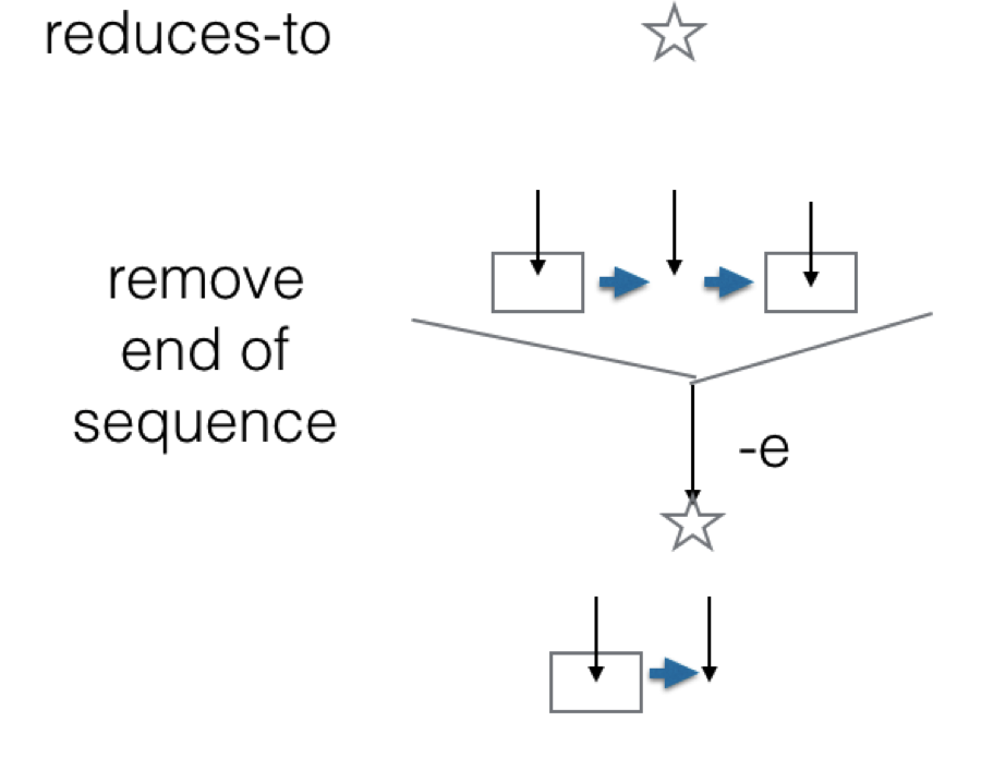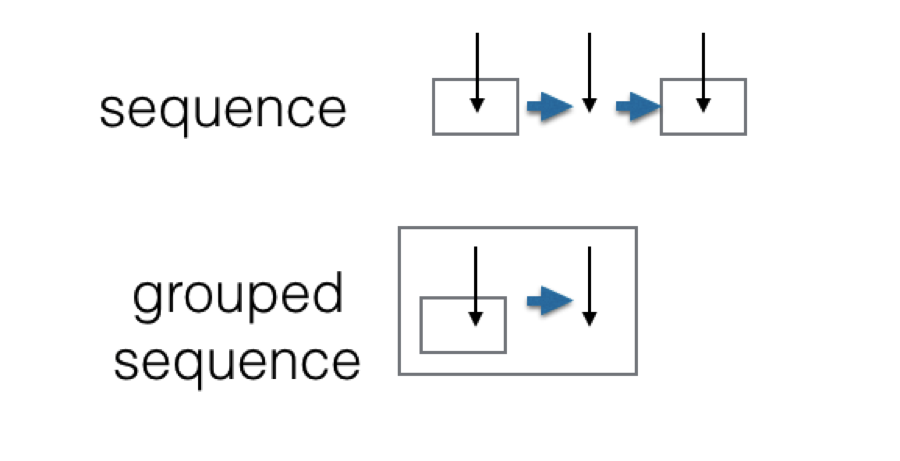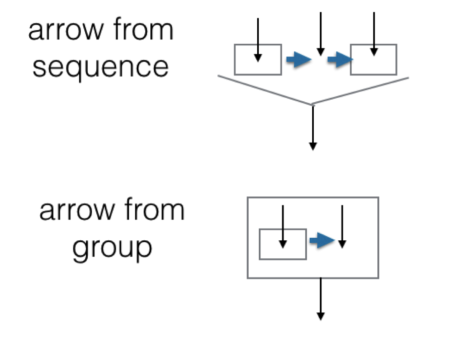 - · An arrow pointing from a grouping (box) around a subsequence, takes the box and its contents as input when enacted