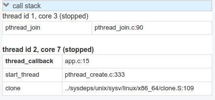 View all threads, the full stack on the active thread, the current frame on inactive threads. Switch between frames on the stack, or threads by pointing and clicking.