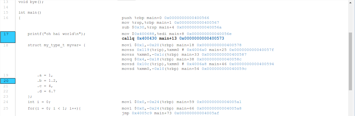 - Show assembly next to source code, highlighting current instruction. Can also step through instructions.