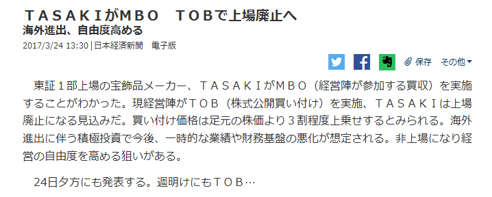 TASAKIがMBO TOBで上場廃止へ https://t.co/40ysiVf4ar