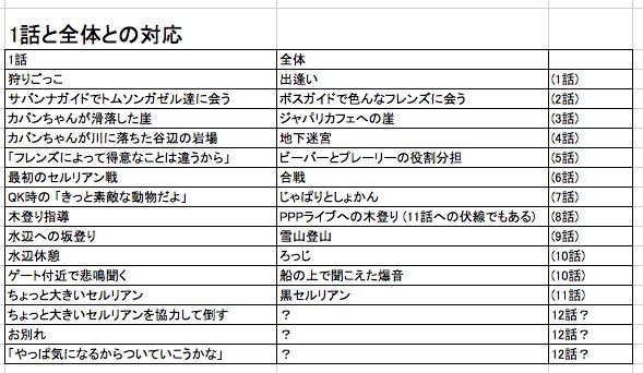 もうちょっと突っ込んでみると、1話 = 1〜12話全体の縮図説がかなりそれっぽい気がして来たぞ。とすると、12話はやっぱり..... #けものフレンズ #けものフレンズ考察班 pic.twitter.com/UxHtuGXeSE