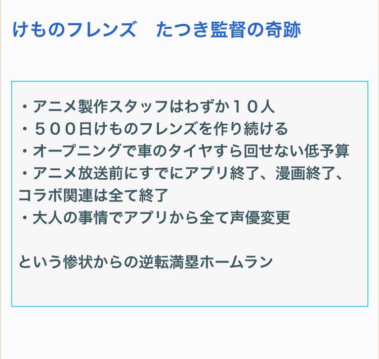 スタッフたったの10人 500日作り続けた OPでタイヤを回せないほどの低予算 放送前にアプリ終了、漫画終了、コラボ関連終了 アプリから全て声優変更 これでこんなになったのは本当に奇跡だと思う #けものフレンズ pic.twitter.com/SHkEUFT1rs